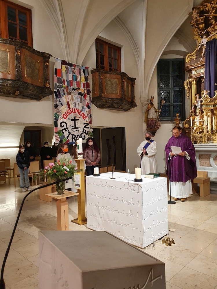 Wir sind von Gott getragen - in der Pandemie und anderen Nöten des Lebens! Diese zentrale Botschaft des ökumenischen Getragen-Tuches, das bis Mitte März in unserer Kirche zu betrachten ist, wurde beim Aschermittwoch-Gottesdienst von Vikar Gerhard Hatzmann und Birgit Zepf sehr schön erläutert. Getragen-Tuch und Aschenkreuz – zwei starke Symbole zu Beginn der Fastenzeit!