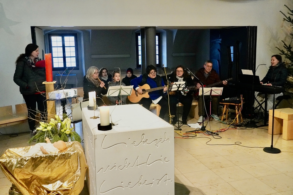 Mit vielen Kindern, Eltern und Großeltern feierte Wort-Gottes-Feier-Leiterin Anja Asel am Nachmittag des Heiligen Abends in unserer weihnachtlich geschmückten Kirche die Geburt des Jesuskindes. Die Feier wurde von unserer „Kirchenband“ mit wunderbaren Weihnachtsliedern musikalisch gestaltet. Begeistert sangen Groß und Klein mit und man spürte die Freude aller, am „Geburtstagsfest des Jesuskindes“ teilzunehmen.